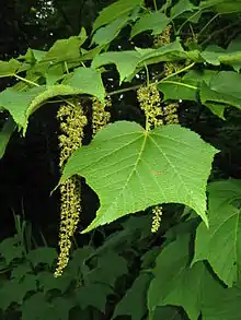 Acer nipponicum is a medium-sized deciduous tree, growing to between 15–20 metres (49–66 ft)[2] and averaging 18 metres (59 ft) tall.[3] The branches and trunk have a smooth grey bark, while young twigs are a smooth, slightly lustrous dark green.[3] The flowers of A. nipponicum are generally andromonoecious, but some trees in groves occasionally are androecious, having only male flowers. Wild specimens flower from about Late June and continue through late July depending on elevation, with trees growing at lower elevation starting to bloom in mid June, and some trees flowering through to early August. The species is found in mountainous regions on the islands of Honshu, Shikoku, and Kyushu in Japan at elevations ranging from 500 to 2,000 metres (1,600 to 6,600 ft). The northernmost groves are near Mount Hachimantai and Mount Iwate in Iwate Prefecture on Honshu. The southernmost groves are in the southeast corner of Kumamoto Prefecture on Kyushu.[3]