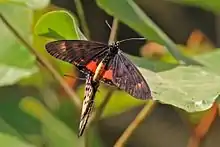 A. zetes is a common species in Africa, distributed from Sierra Leone to Natal and Abyssinia; it develops several races and forms and is darkest in the north-west, gradually becoming lighter and lighter towards the south and east. Forewing with 2 black spots in the cell, one at its apex, large elongate discal dots in 3 to 6 and 10, rounded free discal dots in 1 b and 2 and at least beneath with large yellow marginal spots in lb to 6. Hindwing in addition to the confluent basal dots with a median dot and distinct discal dots, of which the one in 2 is placed close to the base of the cellule and that in 4 further distad than the rest; the black marginal band broad on both surfaces or at least beneath with light spots. - zetes L. Forewing above dark blackish, unicolorous or beyond discal dots 3 to 6 a little lighter; discal dots little distinct on the dark ground. Hindwing above black to the apex of the cell, then with orange-red median band 5 to 6 mm. in breadth, in which only discal dots 3 to 5 are placed free, beneath with whitish ground colour and reddish spots in the basal area and on the marginal band. Sierra Leone (to the Cameroons; transitions to menippe. - menippe Drury (54 b). Forewing above with distinct red-yellow marginal spots and usually also with larger or smaller red-yellow spots in lb, 2 and the cell and with small whitish subapical band in 4 to 6; the red-yellow transverse band on the upperside of the hindwing 10 to 12 mm. in breadth. The female is larger and has the ground-colour black-grey on the forewing, grey-yellowish on the hindwing. Throughout West Africa to Angola and Uganda. - jalema Godt. is an intermediate form between menippe and acara [now Acraea acara ], and has the forewing above black at the base to vein 2 and then a red-yellow transverse band about 12 to 13 mm. in breadth, which extends from the inner margin to the anterior margin of the cell, covers the base of cellules 2 and 3 and encloses 4 black spots (one in the cell, the median spot and discal dots 1 b and 2); subapical band, as in menippe, short and narrow. Cameroons to Rhodesia. - acara Hew. (54 b, c) [now species Acraea acara ] is the South and East African race and only differs from jalema in having the red-yellow colour on the upper surface even more extended and particularly in the fore wing having a large red-yellow subapical band about 7 mm. in breadth in 4 to 6; forewing at the apex black for a breadth of about 6 mm. Natal to Rhodesia, Nyassaland and British East Africa - ab. mhondana Suff. [ Acraea acara ] Discal spots 4 to 6 of the forewing united with the black spot at the end of the cell. Among acara. ab. caffra Fldr. [ Acraea acara ] (= tescea Suff.[ Acraea acara ]) only differs from acara in having the upperside of the hindwing whitish in the middle. Natal; Transvaal. - f. barberi Trim. [ Acraea barberi differs from acara in the forewing above having at the apex a marginal band only 2 mm. in breadth; the black lunulate submarginal line on the upperside of the forewing is sometimes strongly developed, sometimes entirely absent, ab. trimeni Auriv. [ Acraea barberi ] Transvaal and Griqualand. - sidamona Rothsch. and Jord. is similar to acara only differing in having the basal dots in the cell and in 1 b of the forewing free and the marginal dots on the underside of the forewing in 1 b to 5 all completely bordered with black proximally. Abyssinia. - The larva of zetes is orange-yellow with a dark red transverse band dorsally on each segment; head glossy red; spines black; lives in Natal on Passiflora. Pupa reddish white with black markings. [4]