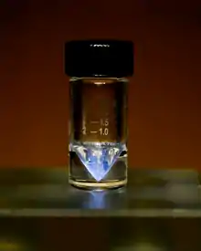 Actinium is a soft, silvery-white,[15][16] radioactive, metallic element. Its estimated shear modulus is similar to that of lead.[17] Owing to its strong radioactivity, actinium glows in the dark with a pale blue light, which originates from the surrounding air ionized by the emitted energetic particles.[18] Actinium has similar chemical properties to lanthanum and other lanthanides, and therefore these elements are difficult to separate when extracting from uranium ores. Solvent extraction and ion chromatography are commonly used for the separation.[19]