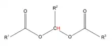 Acylals in organic chemistry are a group of chemical compounds sharing a functional group with the general structure RCH(OOCR)2. Acylals are obtained by reaction of carbonyls with acetic anhydride or other acid anhydrides and a suitable catalyst, for instance with sulfated zirconia[1] at low temperatures when used as protective groups for aldehydes. High temperature exposure converts the acylal back to the aldehyde.