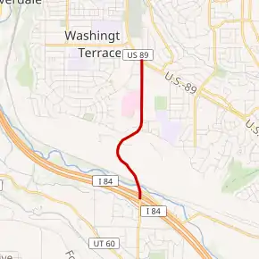 The Adams Avenue Parkway is a 1.6-mile-long (2.6 km)[1] road that is almost entirely within Washington Terrace, Utah, United States, that connects Interstate 84 (I‑84) with U.S. Route 89 (US‑89/Washington Boulevard).[lower-alpha 1] Approximately 1⁄2 mile (800 m) of the southern end of the road is also a private toll road. The southern (toll) section opened in 2001 at a cost of $8.9 million (equivalent to $13.62 million in 2021) and was created after decades of requests by locals to connect the existing 500 East (Adams Avenue) to I‑84. The toll section allowed commuters to bypass the rest of US‑89 through southern Weber County to I‑84.