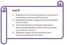 The position of international law as a source of law in Mongolia was elevated following the 1992 Constitution of Mongolia.[6] According to Art 10(3) of the Constitution, international treaties to which Mongolia is a party eventually becomes domestic law, unless they contradict the Constitution itself.[4]