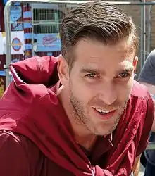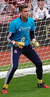On 11 January 2014, Adrián kept his first Premier League clean sheet, in the 2–0 away win over Cardiff City.[20] On 6 May, he attended the club's awards and won "Save of the Season" for a fingertip save from Oscar against Chelsea in January. He also won "Best Individual Performance" for the same match, in which he kept a clean sheet in a goalless draw, as well as "Signing of the Season". He was also named runner-up "Hammer of the Year" to Mark Noble.[21] By the end of the 2013–14 season, he had become West Ham's first-choice goalkeeper, replacing previous incumbent Jussi Jääskeläinen.[22] In an FA Cup third-round replay penalty shoot-out against Everton on 13 January 2015, Adrián saved from Steven Naismith. The shootout went to sudden death, in which he scored the winner after his Everton counterpart, compatriot Joel Robles, struck the crossbar.[23] Despite having never taken a competitive penalty before, he was so confident he would score and win the match that he removed his goalkeeping gloves before taking it – his team won it 9–8.[24]