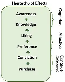 - Lavidge et al.'s Hierarchy of Effects: Awareness→ Knowledge→ Liking→ Preference→ Conviction→ Purchase[54]