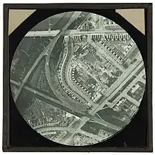 Kite aerial photography was pioneered by British meteorologist E.D. Archibald in 1882. He used an explosive charge on a timer to take photographs from the air.[5] The same year, Cecil Shadbolt devised a method of taking photographs from the basket of a gas balloon, including shots looking vertically downwards.[6][7] One of his images, taken from 2,000 feet (610 m) over Stamford Hill, is the earliest extant aerial photograph taken in the British Isles.[6] A print of the same image, An Instantaneous Map Photograph taken from the Car of a Balloon, 2,000 feet high, was shown at the 1882 Photographic Society exhibition.[7]