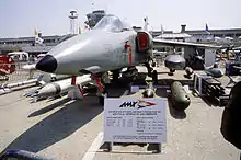 Various munitions could be mounted on the one centerline and four under-wing hardpoints, including bombs, missiles and rockets; payloads of up to 2,000 lb may be carried upon the centerline and the two innermost under-wing pylons, while the outer pylons can carry up to 1,000 lb.[8] All four of the under-wing hardpoints are plumbed for drop tanks to extend the aircraft's range, Italian aircraft are also fitted with a fixed aerial refueling probe.[11] Optical reconnaissance pods can be carried externally on the centerline hardpoint.[6] Wingtip rails are provided for infrared guided air-to-air missiles such as the AIM-9 Sidewinder and MAA-1 Piranha. Italian aircraft are fitted with a M61 Vulcan 20 mm rotary cannon on the port side of the lower fuselage.[8] The United States denied the sale of the M61 to Brazil, thus its AMXs are instead fitted with two 30 mm DEFA 554 revolver cannons.[9][14]