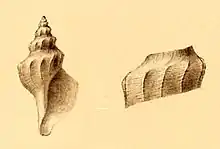 The spire is high, narrow, conical, with profile-lines interrupted by the straight-lined contraction of the shell between the keels of the successive whorls. The apex (eroded) is small and rounded. The spire contains 6-7 whorls. Their profile consists of two straight lines meeting in the keel which bisects the whorls; above is a slowly sloping shoulder, and below a gradual contraction to the suture. The body whorl is scarcely convex on the conical base, which contracts with great regularity to the long, nearly equal-sided snout. The suture is fine, linear, but well defined. The aperture is club-shaped, being rhomboidal above, with a long narrow siphonal canal below. The outer lip is high-arched and then straight along the siphonal canal. Its edge retreats at once to the left, and forms a remote, deep, rounded sinus in the shoulder above the keel. Below this it sweeps out into a high and prominent shoulder. The inner lip is a little concave at the junction of the body and columella, which is straight above, but towards the point is obliquely cut off with a long, narrow, twisted edge, and bends a good deal to the left.[3]