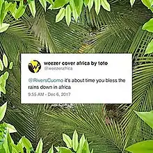 In December 2017, Twitter user "@WeezerAfrica," run by 14-year-old Cleveland, Ohio resident Mary Klym,[55] tweeted, "@RiversCuomo it's about time you bless the rains down in Africa." The band released a cover of "Rosanna", a different Toto song, in order to troll Klym and those clamoring for a version of "Africa".[56]