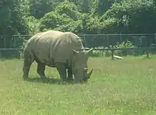 The Rocky Ridge Veldt includes Rothschild's Giraffe, Grant's zebra, Wildebeest, Eland, Barbary sheep, Ostrich, White Rhinoceros, Addax, and Scimitar-horned Oryx. This reserve is grassy with shelters and shade structures and several piles of rocks for animals to climb on.