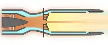 Jet-engine thrust is an application of Newton's reaction principle, in which the engine generates thrust because it increases the momentum of the air passing through it.[4] Thrust depends on two things: the velocity of the exhaust gas and the mass of the gas exiting the nozzle. A jet engine can produce more thrust by either accelerating the gas to a higher velocity or ejecting a greater mass of gas from the engine.[5] Designing a basic turbojet engine around the second principle produces the turbofan engine, which creates slower gas, but more of it. Turbofans are highly fuel efficient and can deliver high thrust for long periods of time, but the design tradeoff is a large size relative to the power output. Generating increased power with a more compact engine for short periods can be achieved using an afterburner. The afterburner increases thrust primarily by accelerating the exhaust gas to a higher velocity.[6]