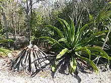 Agave caymanensis is a species of agave that is endemic to Grand Cayman, Little Cayman and Cayman Brac in the Cayman Islands. It can be found in dry shrubland at all elevations of the islands. A. caymanensis gradually forms a short trunk, that is clothed in dead leaves. It can reach heights of 4 m and widths of 3 m with a rosette of massive, succulent leaves rimmed with thorns. It is monocarpic, and flowering is quite synchronous. Young rock iguanas sometimes use the hollow core of dead flower spikes as a refuge. This species was previously confused with A. sobolifera until described by Proctor as a separate species in 2012.