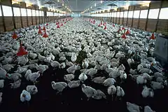 Livestock production systems can be defined based on feed source, as grassland-based, mixed, and landless.[125] As of 2010, 30% of Earth's ice- and water-free area was used for producing livestock, with the sector employing approximately 1.3 billion people. Between the 1960s and the 2000s, there was a significant increase in livestock production, both by numbers and by carcass weight, especially among beef, pigs and chickens, the latter of which had production increased by almost a factor of 10. Non-meat animals, such as milk cows and egg-producing chickens, also showed significant production increases. Global cattle, sheep and goat populations are expected to continue to increase sharply through 2050.[126] Aquaculture or fish farming, the production of fish for human consumption in confined operations, is one of the fastest growing sectors of food production, growing at an average of 9% a year between 1975 and 2007.[127]