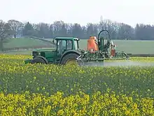 Agriculture, specifically farming, remains a hazardous industry, and farmers worldwide remain at high risk of work-related injuries, lung disease, noise-induced hearing loss, skin diseases, as well as certain cancers related to chemical use and prolonged sun exposure. On industrialized farms, injuries frequently involve the use of agricultural machinery, and a common cause of fatal agricultural injuries in developed countries is tractor rollovers.[107] Pesticides and other chemicals used in farming can be hazardous to worker health, and workers exposed to pesticides may experience illness or have children with birth defects.[108] As an industry in which families commonly share in work and live on the farm itself, entire families can be at risk for injuries, illness, and death.[109] Ages 0–6 May be an especially vulnerable population in agriculture;[110] common causes of fatal injuries among young farm workers include drowning, machinery and motor accidents, including with all-terrain vehicles.[109][110][111]