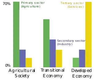Following the three-sector theory, the number of people employed in agriculture and other primary activities (such as fishing) can be more than 80% in the least developed countries, and less than 2% in the most highly developed countries.[103] Since the Industrial Revolution, many countries have made the transition to developed economies, and the proportion of people working in agriculture has steadily fallen. During the 16th century in Europe, for example, between 55 and 75% of the population was engaged in agriculture; by the 19th century, this had dropped to between 35 and 65%.[104] In the same countries today, the figure is less than 10%.[103] At the start of the 21st century, some one billion people, or over 1/3 of the available work force, were employed in agriculture. It constitutes approximately 70% of the global employment of children, and in many countries employs the largest percentage of women of any industry.[105] The service sector overtook the agricultural sector as the largest global employer in 2007.[106]