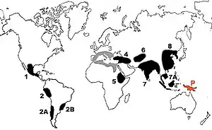 The development of agriculture enabled the human population to grow many times larger than could be sustained by hunting and gathering.[12] Agriculture began independently in different parts of the globe,[13] and included a diverse range of taxa, in at least 11 separate centers of origin.[10] Wild grains were collected and eaten from at least 105,000 years ago.[14] From around 23,000 years ago, the eight Neolithic founder crops, emmer and einkorn wheat, hulled barley, peas, lentils, bitter vetch, chick peas and flax were cultivated in the Levant.[15][16] Rice was domesticated in China between 11,500 and 6,200 BC with the earliest known cultivation from 5,700 BC,[17] followed by mung, soy and azuki beans. Sheep were domesticated in Mesopotamia between 13,000 and 11,000 years ago.[18] Cattle were domesticated from the wild aurochs in the areas of modern Turkey and Pakistan some 10,500 years ago.[19] Pig production emerged in Eurasia, including Europe, East Asia and Southwest Asia,[20] where wild boar were first domesticated about 10,500 years ago.[21] In the Andes of South America, the potato was domesticated between 10,000 and 7,000 years ago, along with beans, coca, llamas, alpacas, and guinea pigs. Sugarcane and some root vegetables were domesticated in New Guinea around 9,000 years ago. Sorghum was domesticated in the Sahel region of Africa by 7,000 years ago. Cotton was domesticated in Peru by 5,600 years ago,[22] and was independently domesticated in Eurasia. In Mesoamerica, wild teosinte was bred into maize by 6,000 years ago.[23] Scholars have offered multiple hypotheses to explain the historical origins of agriculture. Studies of the transition from hunter-gatherer to agricultural societies indicate an initial period of intensification and increasing sedentism; examples are the Natufian culture in the Levant, and the Early Chinese Neolithic in China. Then, wild stands that had previously been harvested started to be planted, and gradually came to be domesticated.[24][25][26]