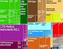 The Dominican Republic's most important trading partner is the United States (over 40% of total commercial exchange; over $12 billion in trade). Other major trade partners are China (over $3 billion in trade), Switzerland (over $1 billion), Puerto Rico (over $800 million), Mexico (over $700 million), Haiti (over $700 million), Spain (over $700 million), the Netherlands (over $700 million), Canada (over $600 million), Brazil (over $500 million), and Germany (over $500 million), in that quantitative order.[28] The country exports free-trade-zone manufactured products (medical devices, electrical equipment, pharmaceuticals, and chemicals), gold, nickel, agricultural products, liquor, cocoa beans, silver, and sauces and seasonings. It imports petroleum, industrial raw materials, capital goods, and foodstuffs. On 5 September 2005, the Congress of the Dominican Republic ratified a free trade agreement with the U.S. and five Central American countries, the Dominican Republic – Central America Free Trade Agreement (CAFTA-DR). CAFTA-DR entered into force for the Dominican Republic on 1 March 2007. The total stock of U.S. foreign direct investment (FDI) in Dominican Republic as of 2019 was U.S. $42 billion, much of it directed to the energy, tourism, real estate, manufacturing, infrastructure and the telecommunications sectors.[16] In 2019 the foreign direct investment stock amounted to $42 billion a significant growth in the last decade and a half.[16] In 2020, during the COVID-19 pandemic, foreign direct investment flows in the Dominican Republic had remained strong at $2.5 billion added to the stock in that year. Having grown to an estimated $44.5 billion, and growing more than ten-fold since 2006 when the liberalization efforts began.[24]