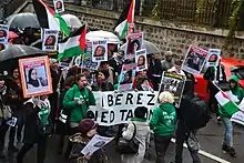 Her cousin was put in a medically induced coma to treat his head injury and regained consciousness a few days later.[15] Footage of the incident was uploaded to Nariman Tamimi's Facebook page and went viral. Days later, on 19 December Tamimi was arrested in a nighttime raid.[16][17][18] Despite concerns about the use of military court for a minor who may have been singled out for "embarrassing the occupation", thirteen days later Tamimi was charged with assault, incitement, and throwing stones; her mother and Nour joined her, having been arrested in relation to the incident.[19] Her mother was also charged with incitement and assault after posting a video in which the indictment claims Tamimi urged violent attacks against Israel.[20] The case drew global attention and spurred debate over the soldiers' restraint in Palestinian and Israeli societies.[21][22] Rallies in support of Tamimi took place in North America and Europe.[23]