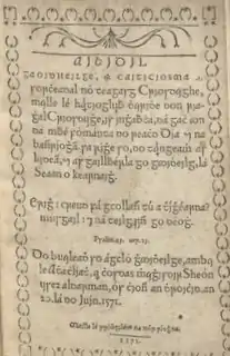 - The last paragraph on the cover page states the location and date of the printing: "Do buaileadh so ágcló ghaoidheilge, a mbaile Atha clíath, ar chosdas mhaighisdir Sheón uiser aldarman, ós chion an dhroichid, an 20 lá do Juín 1571" which translates to "Printed in Irish type in Dublin at the expense of master John Ussher, alderman, [at his house] over the bridge, 20 June 1571".[9][10]