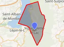 The village of Aiguebelette-le-Lac lies near the southeastern shore of Lac d'Aiguebelette. There is a port and beach on the lake to the north of the town on the shore at Le Port. The commune contains the hamlets of Les Allamans, Les Cambet, La Combe, La Girardière, Le Noyau, Les Prés, Le Port, Les Gustin, Le Bourg, Le Boyat, Côte-Épine, Les Combettes, Le Cugnet, Les Culées, Le Fayet, Malacôte, Le Sauget and Le Platon.[5]