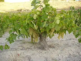 Airén is a variety of Vitis vinifera, a white grape commonly used in winemaking. This grape is native to Spain where it represents almost a quarter of all grapes grown. As of 2010, Airén was estimated to be the world's 3rd most grown grape variety in terms of planted surface, at 252,000 hectares (620,000 acres), down from 306,000 hectares (760,000 acres) in 2004, where it held 1st place, although it is almost exclusively found in Spain.[1] Since Airén tends to be planted at a low density, several other varieties (including Cabernet Sauvignon and Merlot) are more planted in terms of number of vines.