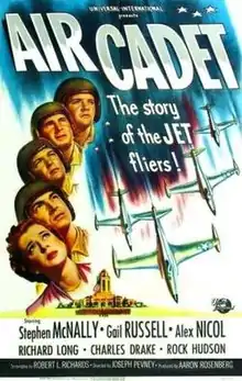 Air Cadet (titled Jet Men of the Air in the UK) is a 1951 American drama war film directed by Joseph Pevney and starring Stephen McNally, Gail Russell, Alex Nicol and Richard Long. Air Cadet featured United States Air Force (USAF) pilots in training along with actors mixed into the training courses.[2] [Note 1] The film had a small early role for 26-year-old Rock Hudson and a scene with future astronaut Gus Grissom.