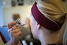 Airbrush makeup is makeup sprayed onto the skin using an airbrush machine instead of being applied with sponges, brushes, fingers, or other methods.[1] A typical airbrush system uses a compressor to create airflow through a hose connected to a trigger-controlled spray painting gun. The airbrush pressure can be adjusted to apply various types of makeup, such as lighter, heavier, or more detailed styles. Airbrushes are used in film, theater, bridal makeup, and sunless tanning. Airbrush systems designed for personal, in-home use are usually smaller and work at a lower pressure than systems used in professional applications.