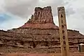 Airport Tower is a 700-foot (210-meter) tall sandstone butte located in the Island in the Sky District of Canyonlands National Park, in San Juan County, Utah.[3] It is situated 1.64 mile east of Washer Woman, which is a towering arch similar in height. Each are composed of Wingate Sandstone, which is the remains of wind-borne sand dunes deposited approximately 200 million years ago in the Late Triassic. The nearest higher neighbor is Monster Tower, 1.6 mi (2.6 km) to the west, Tiki Tower is one-half mile northwest, and Mesa Arch is situated 3.2 mi (5.1 km) to the west.[1] A short hike to Mesa Arch provides the easiest view of Airport Tower. Access to this tower is via the four-wheel drive White Rim Road, which is another option to see Airport Tower. The top of this geological formation rises 1,400 feet above the road in less than one mile. Precipitation runoff from Airport Tower drains southeast into the nearby Colorado River via Buck and Lathrop Canyons. This geographical feature's name was officially adopted in 1986 by the U.S. Board on Geographic Names. It was so named because the rock formation resembles the appearance of an airport control tower.[3]