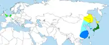 | The native range of the mandarin duck, and parts of its introduced range where it is established breeding   Breeding   Native resident   Migrant   Winter visitor   Introduced resident | |