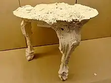 In regards to furniture, the volcanic ash which engulfed the city often penetrated into the houses in large quantities and, in these layers of fine volcanic dust, produced negatives of the disintegrated wooden objects. Using these negatives as molds, liquid plaster-of-Paris can be poured in and produce casts of parts, or even entire pieces of furniture such as beds, tables, chairs or stools. Offering tables are one of the most common finds in Akrotiri and were either made of clay or coated with plaster, decorated in the same technique as the wall paintings, and only consisted of three highly decorated legs and a top.[8]
