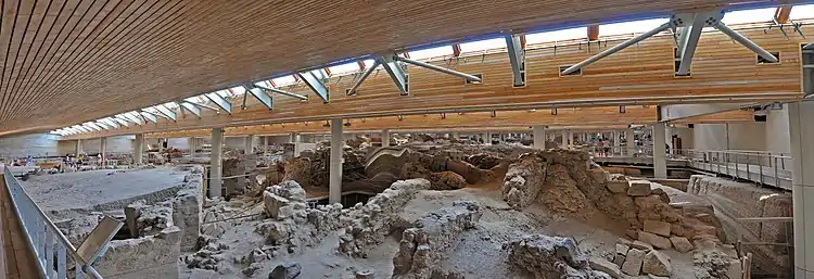 The Akrotiri excavation site is of a Cycladic cultural settlement on the Greek island of Santorini, associated with the Minoan civilization due to inscriptions in Linear A, and close similarities in artifact and fresco styles.[3] The excavation is named for a modern village situated on a hill nearby. The name of the site in antiquity is unknown.
