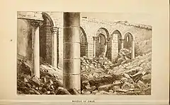 Damage to Bosra began in 2012, as shells and tanks caused significant damage during the Syrian civil war. In 2014, shell crater damage caused a hole in the roof of the mosque, and the upper level of the mosque was also destroyed.[4] Rubble from the mosque is scattered around the destruction site, and there is shell damage in the surrounding area as well. In March 2015, rebels captured Bosra from the Syrian Government after heavy shelling of the town and caused further damage to the area.