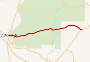 SR 148 begins at an intersection with SR 21 in the central business district of Sylacauga.[2] From this point, SR 148 follows a meandering easterly route through the Talladega National Forest en route to its eastern terminus at SR 9 in Millerville.[3]