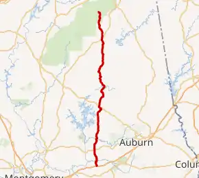 After weaving through rural Tallapoosa County for several more miles, the route crosses into Macon County, where it enters Franklin. It makes a left turn onto the right-of-way of County Road 36, which carries it to its southern terminus at Interstate 85. Travelers can access Auburn, Atlanta, Montgomery, and Tuskegee from this intersection.