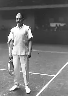 In the absence of Koželuh he won the Deauville tournament in 1927, meeting Joseph Negro, Howard Kinsey and his own brother Edmund in the final pool, and beating them all without losing a set.[16] On account of this victory he was saluted as "champion of the world",[17] and he was the acknowledged Champion of France when, in the following year, he played in the 1928 Bristol Cup competition and appeared at the World Professional Singles Championship at Queen's Club, defeating the title holder, Dan Maskell, in the third round.[18] Playing against his brother Edmund and their assistant coach at Cannes, Robert Ramillon, Albert won the doubles final at Queen's with Roman Najuch as his partner, but it was Ramillon who defeated Edmund to take the singles title.[19]