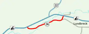 From west to east, the first segment of Highway 3A begins west of the Highway 3 intersection with Highway 22, east of Burmis, and ends east of the same intersection with Highway 22, west of Lundbreck. This 3.6 km (2.2 mi) segment crosses the Crowsnest River and provides a viewing opportunity of Lundbreck Falls.[2] The highway was formed in 1967 when Highway 3 was realigned across a new bridge Crowsnest River.