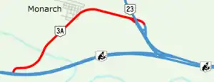 The second segment is 6.8 km (4.2 mi) in length, beginning 21 km (13 mi) east of Fort Macleod. Highway 3A splits to the north from Highway 3 and runs through the Hamlet of Monarch along the Canadian Pacific Railway tracks, before merging with Highway 23 and rejoining Highway 3 at a point 19 km (12 mi) west of Lethbridge.[2] The highway was commissioned in 1996 when Highway 3 was twinned and realigned in the area.