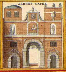 The name Aldersgate is first recorded around 1000 in the form Ealdredesgate, i.e. "gate associated with a man named Ealdrād"; the gate probably acquired its name in the late Saxon period.[2]