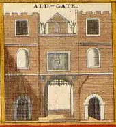 It is thought that a gate at Aldgate spanned the road to Colchester in the Roman period, when London Wall was constructed. The gateway – which probably had two circular towers – stood at the corner of the modern Duke's Place, on the east side of the city, with a busy thoroughfare passing through it.[6] It was rebuilt between 1108 and 1147, again in 1215, and reconstructed completely between 1607 and 1609 "in a more classical and less functional style".[7] Like London's other gates, Aldgate was "fortified with porticullises and chained" in 1377 due to concerns about potential attacks by the French.[6] The gate was finally removed in 1761; it was temporarily re-erected at Bethnal Green.