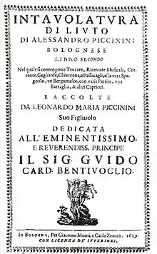 He is best known for his two volumes of lute music: Intavolatura di Liuto et di Chitarrone, libro primo (Bologna, 1623) and Intavolaturo di Liuto (Bologna, 1639), the latter published posthumously by his son Leonardo Maria Piccinini. The 1623 collection is of particular importance because of Piccinini's lengthy preface, which includes a detailed manual on performance, as well as claims to have invented the archlute (Piccinini also made important modifications to the chitarrone). Piccinini concentrated on toccatas, courantes and galliards, as well as different kinds of variations. No other works by Piccinini are known; his music for La selva sin amor, the first opera performed in Spain, composed by his brother Filippo Piccinini is lost.[1]