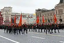 Russian Soldiers dressed in historical Soviet parade uniforms carrying the Red Army combat banners which received the Order of Alexander Nevsky during the Second World War.