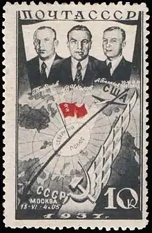 The fliers set another record by performing the first non-stop polar flight and establishing a new route from the Soviet Union to the United States.[1]