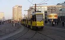 In 1993, architect Hans Kollhoff's master plan for a major redevelopment including the construction of several skyscrapers was published.[13] Due to a lack of demand it is unlikely these will be constructed. However, beginning with the reconstruction of the Kaufhof department store in 2004, and the biggest underground railway station of Berlin, some buildings were redesigned and new structures built on the square's south-eastern side. Sidewalks were expanded to shrink one of the avenues, a new underground garage was built, and commuter tunnels meant to keep pedestrians off the streets were removed.[13] The surrounding buildings now house chain stores, fast-food restaurants, and fashion discounters.[13] The Alexa shopping mall, with approximately 180 stores opened nearby in 2007, and a large Saturn electronic store was built and opened in 2008. The CUBIX multiplex cinema, which opened in November 2000, joined the team of Berlin International Film Festival cinemas in 2007, and the festival shows films on three of its screens.[14] In January 2014, a 39-story residential tower designed by Frank Gehry was announced, but this project was put on hold in 2018.[15]