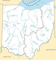 The investigating commission issued its report on January 21, 1824.[73] The report recommended that the northern terminus be near the mouth of the Cuyahoga River. The canal route followed the Cuyahoga from Cleveland to Akron, the Tuscarawas River from Akron through Dover to Coshocton, the Muskingum River from Coshocton to Zanesville, and the Licking River from Zanesville to Newark. The proposed route then proceeded overland from Newark south to Licking Summit Reservoir (now Buckeye Lake) and then overland again to Baltimore and Carroll before turning northwest toward Canal Winchester. Thereafter, the report recommended that the canal generally follow Big Walnut Creek to Columbus, and then the Scioto River south from Columbus through Chillicothe to Portsmouth on the Ohio River. The investigating commission also recommended simultaneous construction of the Miami and Erie Canal from Cincinnati at least as far as Dayton.[70]