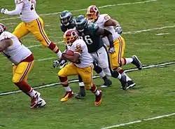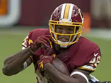Morris finished the 2014 season with 1,074 rushing yards on 265 carries and eight rushing touchdowns along with 155 receiving yards on 17 receptions.[88] Morris achieved his third consecutive season of 1,000+ rushing yards by the end of the 2014 season. With this achievement, he became the fourth running back in the Redskins' franchise history to have at least three 1,000-yard seasons along with John Riggins, Clinton Portis, and Stephen Davis.[89] Morris was ranked 11th in rushing yards, only 1 of 13 players to break 1,000 rushing yards, and ranked 2nd among third-year backs, just behind Miami Dolphins' Lamar Miller.[90][91] Morris ranked eighth in rushing touchdowns, but ranked second amongst the 2012 Draft class, behind Minnesota Vikings' Matt Asiata with nine and tied with Miami Dolphins' Lamar Miller with eight.[92][93] He went to the 2015 Pro Bowl as an alternate for LeSean McCoy.[94] Morris' 3,962 career rushing yards at that time placed him sixth all-time in Redskins' history, just twelve yards more than Earnest Byner with 3,950.[95]