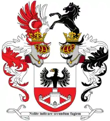 On 15 March 1916, Emperor Franz Joseph I. ennobled him with the title of Ritter[3] and allowed him to add a place name to his surname, which was then a standard procedure in Austria. As part of the process, Rappaport was invited by the authorities to propose a coat of arms and three place names from which one would be chosen. The three choices Rappaport submitted were Arward ("of Vardar"), Drineck ("of Drin"), and Arbengau (deriving from the Latin term Arbanum for the Albanian people and gau, a country subdivision used by Germanic-speaking peoples). As the first two were already in use by other noble families, the authorities chose Arbengau.