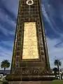 The memorial is built in brick covered by faience work. The supporting angles are formed to represent the trunks of gum-trees, branching out into leaves and cones under the main cornice, and the roots are shown on a bold projection above the base. Above the main cornice is a cross of a deep golden colour, which stands out clearly from the green tone of the general mass of work. One panel shows the names of the seven soldiers from St. Kilda who died. Two other panels record the names of the 58 who fought the Empire's battles and returned. On the fourth panel is the figure of a soldier, dressed in Australian khaki, and facing the sea. Above the main column is a wrought-iron pillar, supported by brackets, enriched with shields ; and under the golden cross rests a finely executed wreath on each panel.