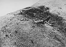 Around 10:23–24 PM, the aircraft (coming from Ponente-lato Terrasini) hit a crest 935 meters (1,980 feet) high,[1] about 300 feet (91 m) below the top of the mountain, and slid for a long time on the ground with its wings, its fuselage, and its four engines, until it disintegrated in the successive hits against the rocks of the crest. Part of the debris and bodies of the victims rolled on the mountain side (Carini side) from where the kerosene fire was witnessed. The wreckage was strewn across a 2.5-mile (4.0 km) area, so wide it took rescue teams three hours to reach it. Later on, some witnesses at Carini said that they had seen the aircraft on fire before the crash.