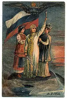 The All-Russian nation (Russian: общерусский народ, romanized: obshcherusskiy narod), also known as the pan-Russian nation or the triune Russian nation (Russian: триединый русский народ, romanized: triyedinyy russkiy narod) is an Imperial Russian[1] and Russian irredentist ideology which sees the Russian nation as comprising the three sub-nations Great Russians, Little Russians and White Russians, which include modern East Slavs (namely, Russians, Rusyns, Ukrainians and Belarusians), rather than only modern Russia and ethnic Russians.[2][3]