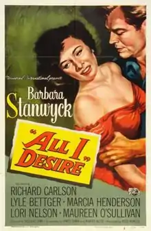 All I Desire is a 1953 American drama romance film directed by Douglas Sirk and starring Barbara Stanwyck, Richard Carlson, Lyle Bettger, Marcia Henderson, Lori Nelson, and Maureen O'Sullivan. It is based on Carol Ryrie Brink's 1951 novel Stopover.