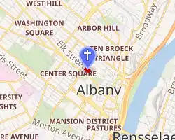 The cathedral is located on the south corner of the intersection of Elk and South Swan Streets. The terrain slopes gently toward the Hudson River a half-mile (1 km) to the east, and sharply into Sheridan Hollow and Arbor Hill to the immediate north. The cathedral's 2-acre (8,100 m2) lot is in the northern corner of the Lafayette Park Historic District, at the edge of central Albany's developed area.[1]